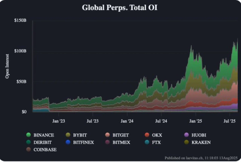 21日(現地時間)、オンチェーンデータプラットフォームUnfolded(アンフォルデッド)によると、仮想資産(暗号資産)永久先物の未決済建玉規模が1,255億1,000万ドルに達し、過去最大を更新した。