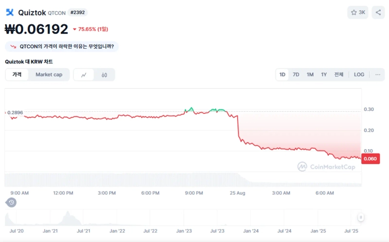 25日(韓国時間)午前8時27分現在、クイズトークは仮想資産取引所ビッサムで前日比76.58%急落した0.062ウォンで取引されています。同時刻、クイズトークはアップビットUSDTマーケットでも前日比49.12%下落した0.000029ドルで取引されています。