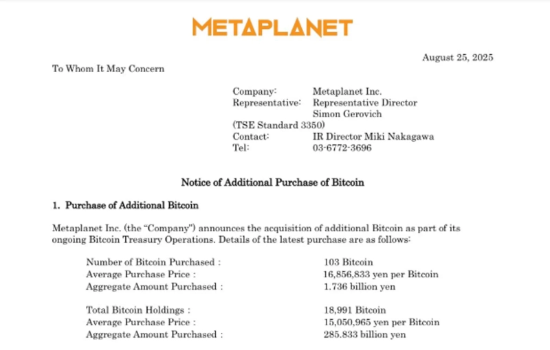 25日(現地時間)、メタプラネットは公式X(旧Twitter)を通じて「ビットコイン103 BTCを平均取得価格16,856,833円で購入した」と発表しました。