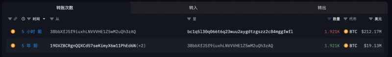 5年間活動がなかったクジラのウォレットからビットコイン(BTC)が移動しました。