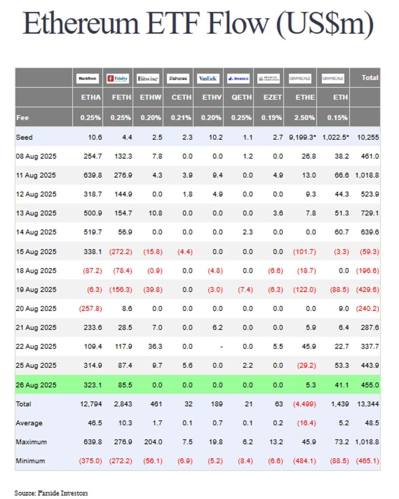 26日(現地時間)、ファーサイド・インベスターのデータによると、イーサリアム現物ETFには合計4億5500万ドル相当の資金が流入しました。最も多くの資金が流入したのはブラックロックのETHAで、約3億2310万ドルにのぼり、次いでフィデリティのFETH(8550万ドル)、グレースケールのETHE(530万ドル)が続きました。