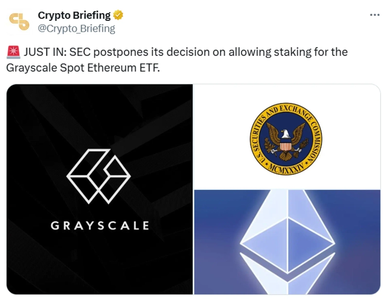 - 米国SECがグレースケールのイーサリアム(ETH)現物ETF内のステーキングサービスの審査期限を延長したと伝えられた。