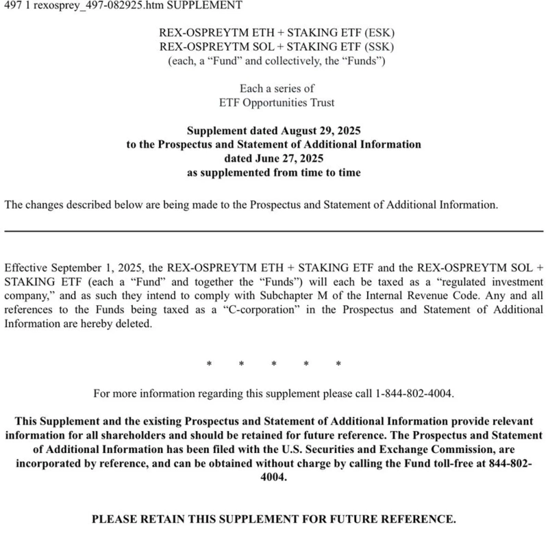 30日(現地時間)、エリック・バルチュナス(ブルームバーグのアナリスト)はXを通じて「レックス−オスプレイのソラナ・ステーキングETFは従来のCコーポレーション構造から登録投資信託(Registered Investment Company·Inv Co)の形態に移行する」と伝えた。