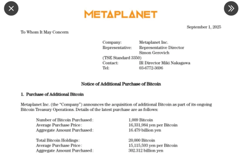 - メタプラネットが ビットコイン 1009個を追加購入したと発表した。