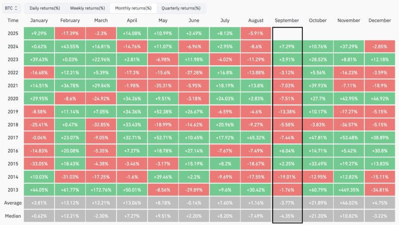 今月の見通しも明るくない。特に9月は一年の中で仮想資産の下落傾向が顕著に表れる期間とされる。コイングラスによれば、2013年から昨年までの約10年間でビットコインの9月平均収益率は-3.77%を記録した。
