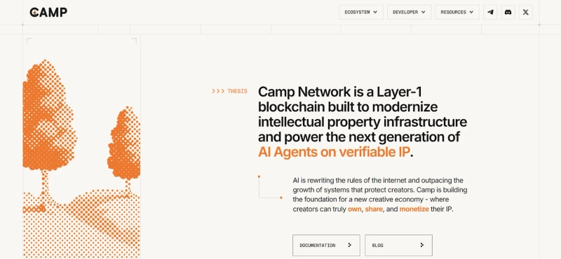 Camp Networkは単なるプラットフォームではなく、知的財産(IP)の発行・流通・清算をオンチェーンで処理するよう設計されたIP特化のレイヤー1ブロックチェーンで、創作物とデータをトークン化してAIと接続する次世代インフラを目指す。インターネットの基盤であるIPレイヤーをブロックチェーンとAI中心に再設計し、データと創作物が分散型インフラで管理され、AIエージェントが自動でライセンスを取得し著作権を透明に追跡できるようにする。