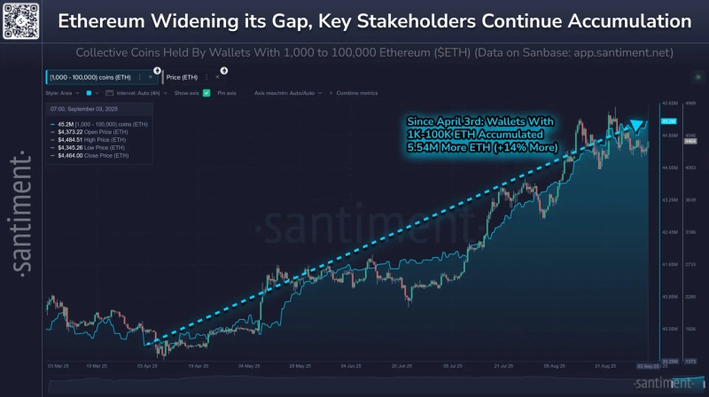 - "イーサリアム(ETH)の保有量が最近5か月で14%増加したとSantimentが明らかにした。"