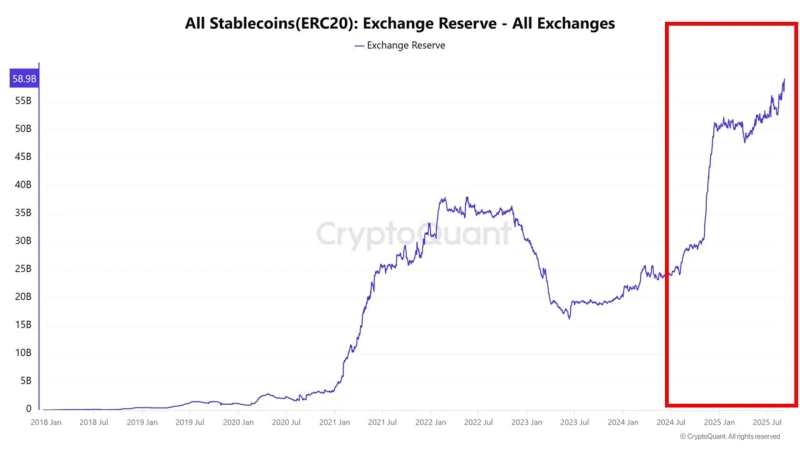 7日(韓国時間)、CryptoQuant寄稿者『XWIN Research Japan』はレポートで「9月現在、取引所預託のステーブルコインは590億ドルで史上最大を記録している」とし、「ステーブルコイン預託規模が急増すると強気相場の到来の可能性が高いことを意味する」と分析した。