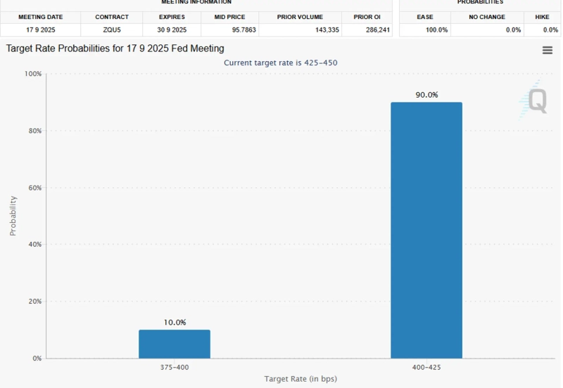 シカゴ商品取引所(CME)のフェドウォッチ・ツールによると、市場は9月の利下げ可能性を高く見積もっている。25bpを引き下げる確率が90%、50bpを引き下げる確率は10%だ。