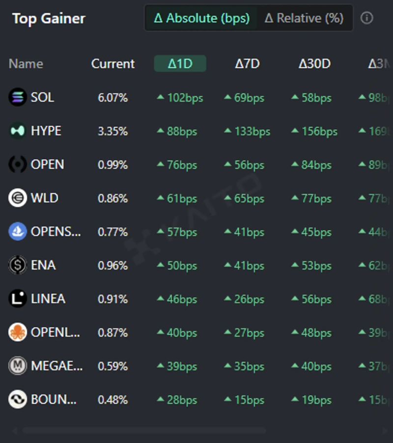 人工知能(AI)ベースのWeb3検索プラットフォーム、カイト(Kaito)のトークン・マインドシェア(Token Mindshare·仮想資産市場内の特定トークンの影響力を定量化した指標)のトップゲイナーによれば、9日現在、最も注目を集めている仮想資産関連キーワード上位5つはソラナ(SOL)、ハイパーリクイッド(HYPE)、オープンレジャー(OPEN)、ワールドコイン(WLD)、オープンシーなどだ。
