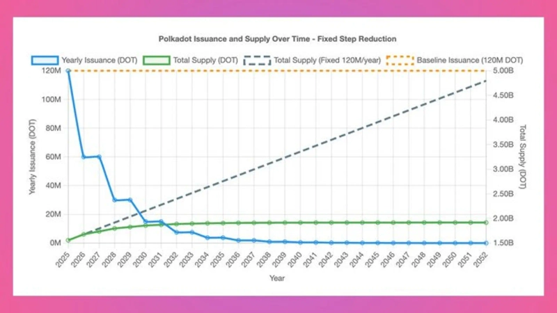 これにより、従来の年間1億2,000万個のポルカドットを発行する無制限発行モデルの代わりに、2年ごとに新しいトークン発行量を減らす新たなトークノミクスが適用される見込みだ。