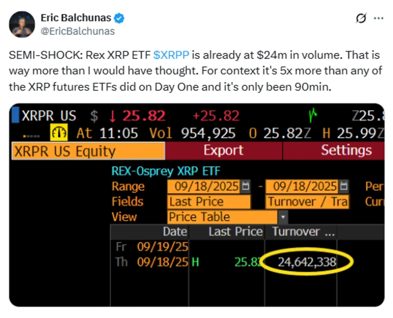 18日(現地時間)、ブルームバーグのETF専門アナリスト、エリック・バルチュナスは公式X(旧ツイッター)を通じて「本日上場したレックス-オスプリー エックスアールピー(XRP)ETF(XRPR)の取引量はすでに2400万ドルを超えた」と述べ、「予想をはるかに上回る水準だ」と明らかにした。