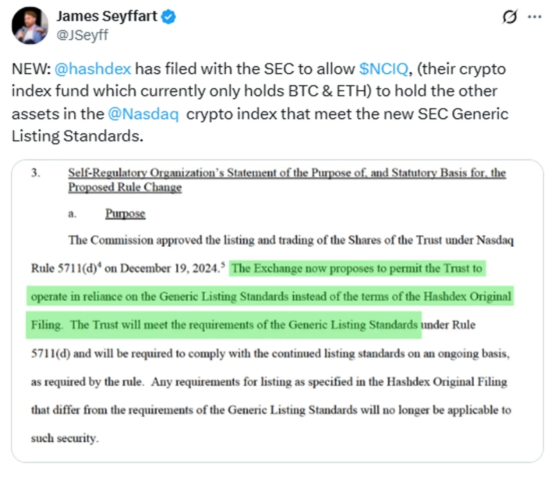 23日(現地時間) ブルームバーグのETF専門アナリスト ジェームズ・セイファート(James Seyffart)によると、ハッシュデックス(Hashdex)が証券取引委員会(SEC)にビットコイン(BTC)とイーサリアム(ETH)のみを保有する自社のクリプト・インデックス・ファンド(NCIQ)に他の仮想資産(暗号資産)も追加できるよう許可してほしいという申請書を提出した。
