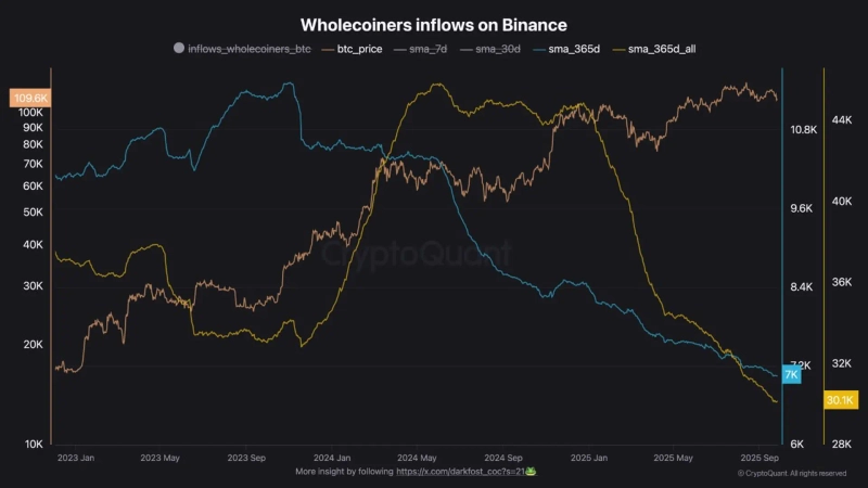 29日(韓国時間)、CryptoQuant寄稿者ダークフォスト(Darkfost)はレポートで「世界最大の取引所バイナンスの取引所流入量によれば、ホールコイナーたちの最近の取引所流入量は7000BTCを記録し、2023年11月(1万1500BTC)と比べて急減した」とし、「他の取引所の流入量も2024年5月(4万5000BTC)と比べて急減し、3万BTCを記録している」と分析した。