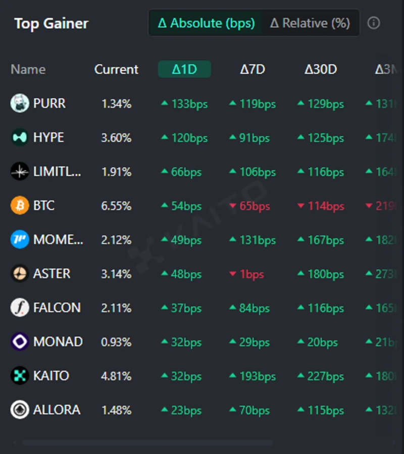 - AIベースの検索プラットフォーム・カイトのトップゲイナーによると、投資家が最も関心を示している仮想資産のキーワードはHYPURR、ハイパーリクイッド、リミトレス、ビットコイン、モメンタムだと伝えた。