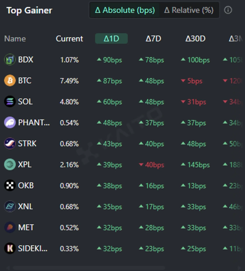 人工知能(AI)ベースのWeb3検索プラットフォームカイト(Kaito)のトークン・マインドシェア(Token Mindshare、仮想資産(暗号資産)市場内の特定トークンの影響力を定量化した指標)トップゲイナーによると、1日現在、人々が最も関心を示している仮想資産関連キーワード上位5つはベルデックス(BDX)、ビットコイン(BTC)、ソラナ(SOL)、ファントム、スタークネット(STRK)などだ。
