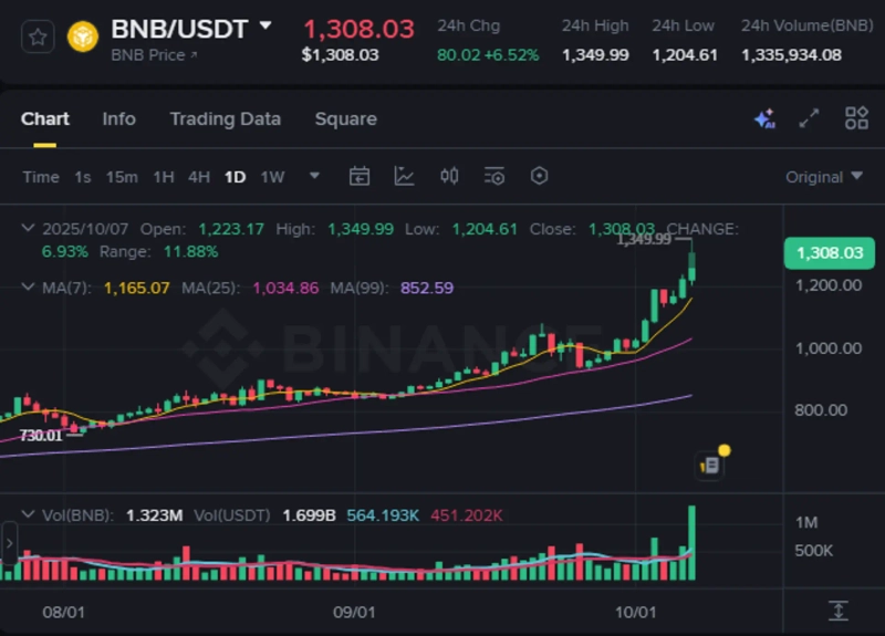 8日(韓国時間)午前7時41分現在、バイナンスコインはバイナンスで前日比6.61%上昇し1308ドルを記録している。これは前週比で約30.59%上昇した水準だ。