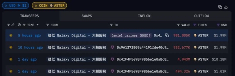 8日(韓国時間)、オンチェーンアナリスト ai_96894xtpaは X(旧Twitter)を通じて "ギャラクシー・デジタルと推定されるアドレスがバイナンスに397万8000ドル相当のアスター(ASTER)トークンを入金した"と伝えた。