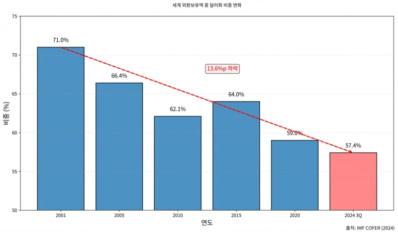 ロイター通信などによれば、国際通貨基金(IMF)の統計を引用して世界の中央銀行の外貨準備のうち米ドルの比率は最近低下傾向を示している。2001年に約71%だったドル比率は昨年の第3四半期には57.4%に落ちた。IMFの『各国の外貨準備の通貨別構成報告書(COFER)』の最新データ(2024年第4四半期基準)でもドル資産は世界の公式外貨準備の57.8%を占めるにとどまった。10年前より約9パーセントポイントの減少だ。