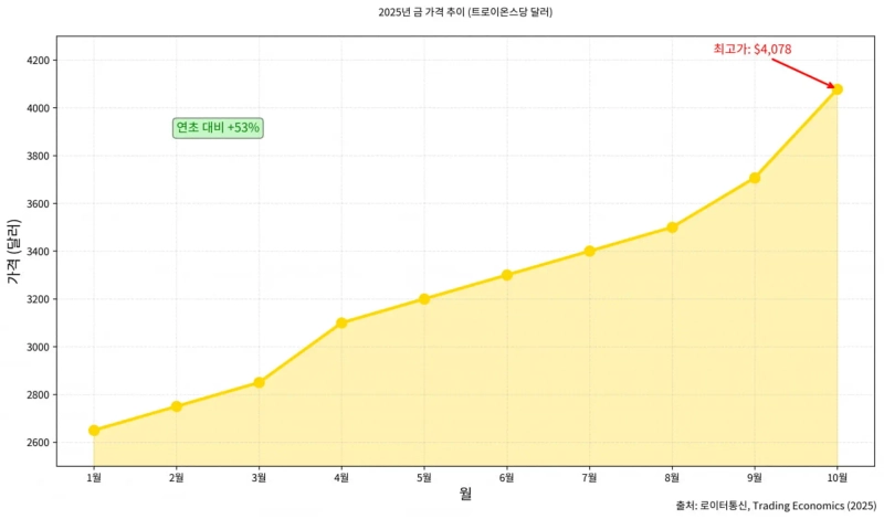 15日、ロイター通信によると国際現物金価格はトロイオンス当たり4078ドルを記録し史上最高値を更新した。今年に入ってだけで53%以上急騰した数字だ。1979年の第2次オイルショック以来、最も爆発的なラリーだという分析である。