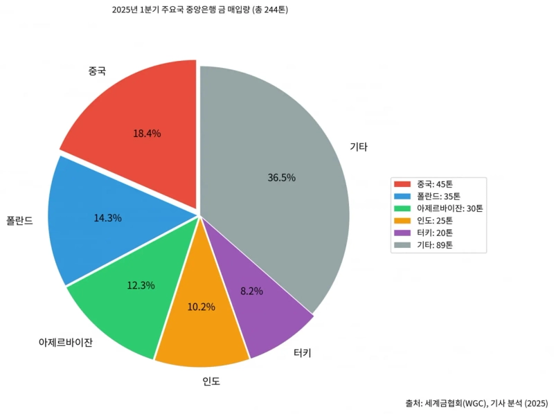 具体的に見ると、新興国や最近地政学的リスクに関連する国が金を好む。ロシアと中国が代表例だ。中国人民銀行は2015年に外貨準備に対する金の比率が1.8%にすぎなかったが、最近は4.9%まで引き上げた。ロシアも2022年のウクライナ戦争以降、西側の金融制裁を懸念してドル資産の代わりに金保有を大幅に増やした。トルコ、インド、カザフスタン、ウズベキスタン、タイなども買いの列に加わった。今年第1四半期だけでも中国、ポーランド、アゼルバイジャンなどが積極的に金を買い、四半期合計で244トンの純買いを記録した。最近5年の平均より25%大きな規模だ。