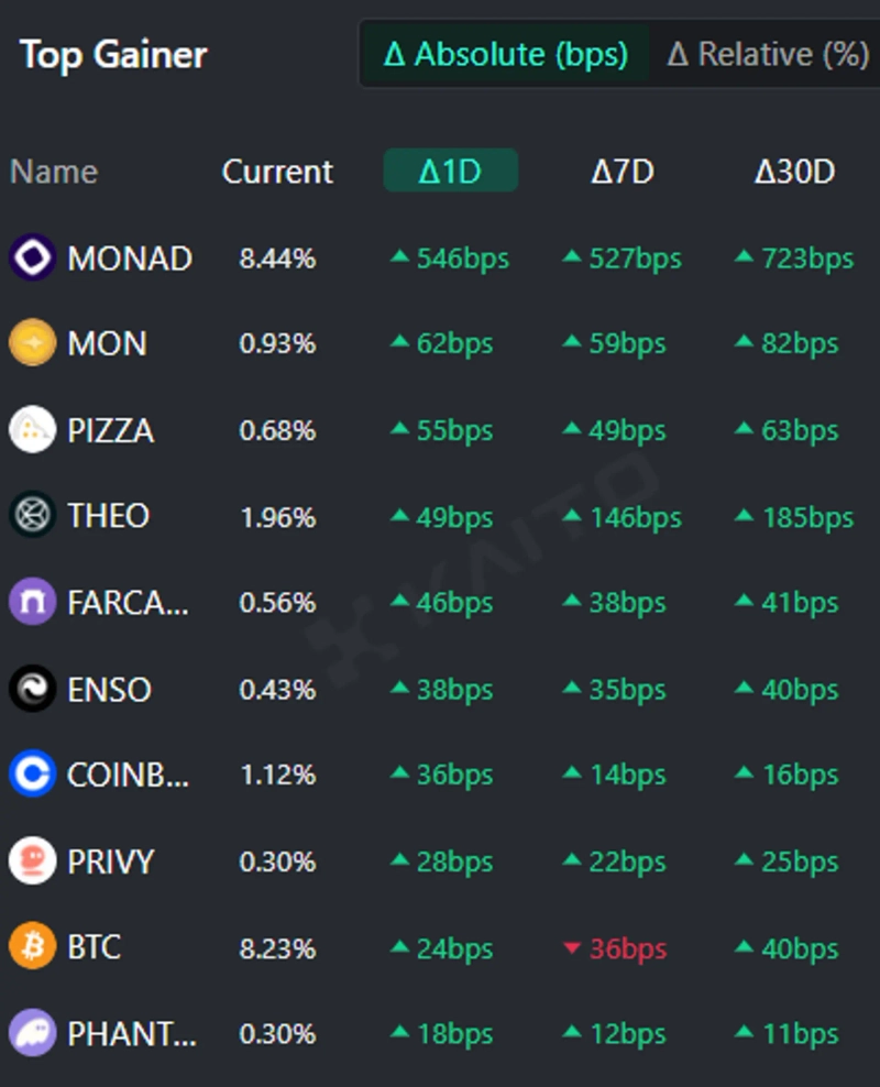 人工知能(AI)ベースのWeb3検索プラットフォーム、カイト(Kaito)のトークン・マインドシェア(Token Mindshare、仮想資産(暗号通貨)市場内の特定トークンの影響力を定量化した指標)トップゲイナーによれば、14日現在、人々が最も関心を示している仮想資産関連キーワードはモナド(MONAD)、テオ(THEO)、コインベース(BASE)、ビットコイン(BTC)、ファントム(PHANTOM)などです。