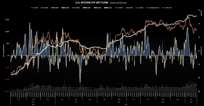 ETF別に見るとブラックロック(IBIT)が1億736万ドルで最も多くの資金が流入した。続いてビットワイズ(BITB)が1741万ドル、フィデリティ(FBTC)が722万ドルの純流入を記録した。