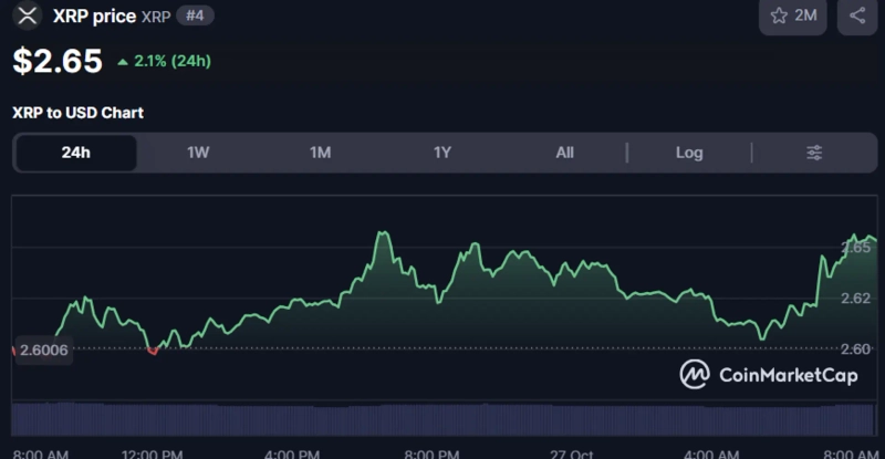27日(韓国時間)午前8時44分現在、エックスアールピーはCoinMarketCap基準で前日比2.1%上昇の2.65ドルを記録している。これに伴う時価総額は1592億1000万ドルだ。