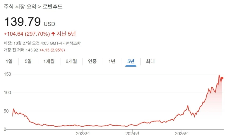 米国ナスダックでロビンフッドの株価は今年に入って254%跳ね上がった。先月2日から24日までの上昇幅だけでも38.63%に達する。同期間のナスダック指数の上昇率(9.05%)を大きく上回る。