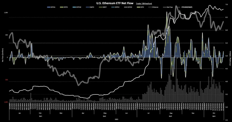 ブラックロック ETHAが7180万ドルで純流入を主導し、次いでビットワイズ ETHW(+2260万ドル)、グレースケール ETH(+1580万ドル)、フィデリティ FETH(+1150万ドル)などが続いた。