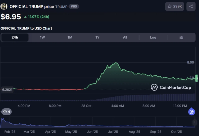 28日(韓国時間)午後1時59分現在、オフィシャルトランプはCoinMarketCap基準で前日比11.07%上昇の6.95ドルで取引されている。